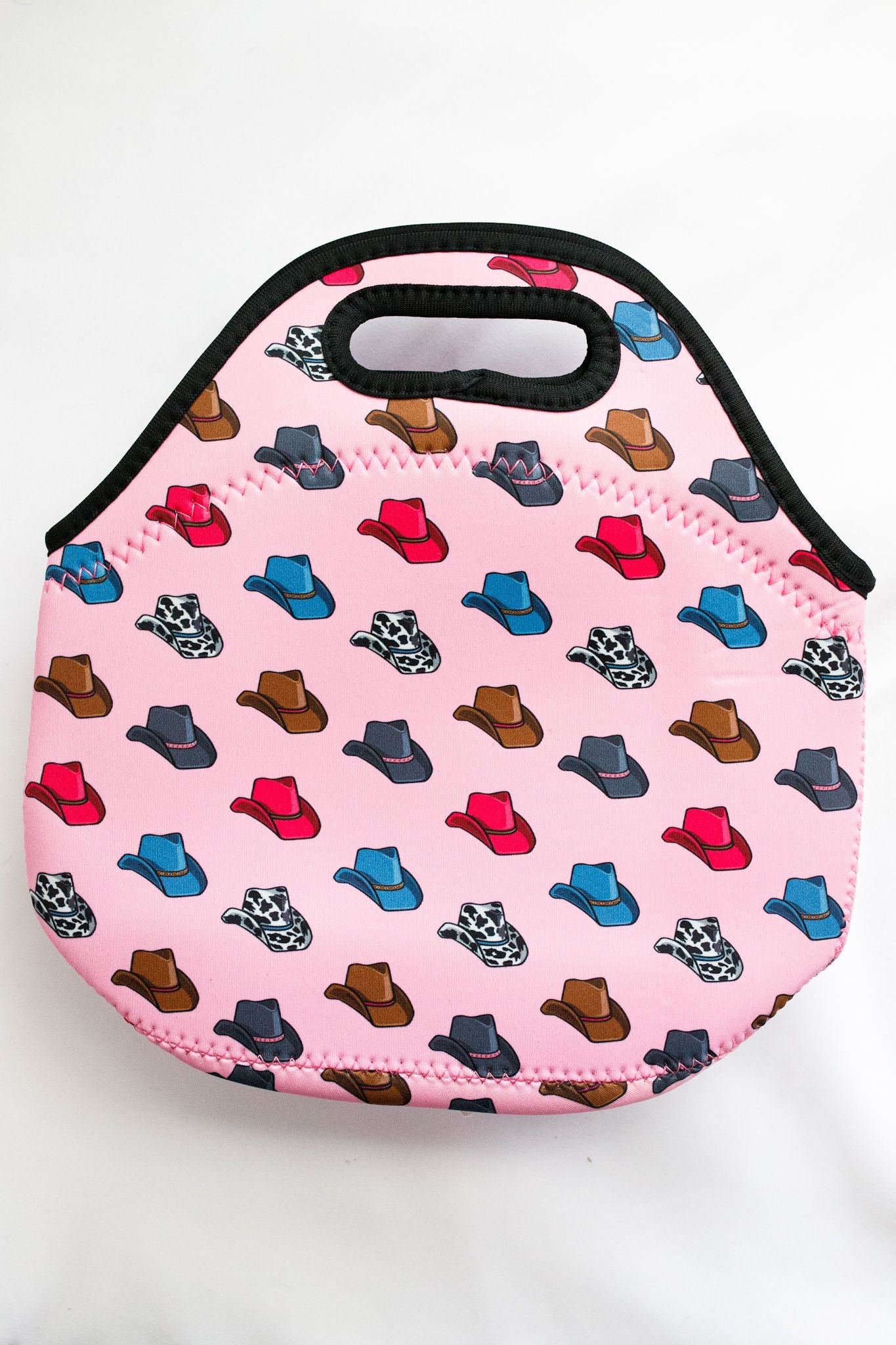 The Pink Cowboy Hat Lunch Tote is perfect for school or work lunches. It's made of neoprene which is wipeable; or throw the whole lunch bag in the washing machine on "gentle cycle"! Lightweight and condensation free. Wide bottom that accommodates most food containers. Folds flat for easy stashing post-lunch! Top handles are great for grab and go lifting. Lunch with style!