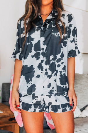 This 2-piece black cowhide pajama set features a silky satin-feel fabric, ruffles on shorts hem and button-down closure. Perfect for adding a touch of cute western flare to your loungewear! These pajamas are perfect for bridal parties, to give as a gift, or to just treat yourself!