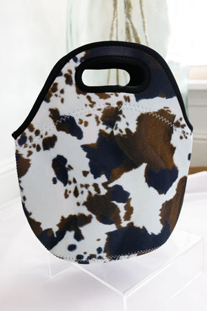 The Brown Cowhide Lunch Tote is perfect for school or work lunches. It's made of neoprene which is wipeable; or throw the whole lunch bag in the washing machine on "gentle cycle"! Lightweight and condensation free. Wide bottom that accommodates most food containers. Folds flat for easy stashing post-lunch! Top handles are great for grab and go lifting. Lunch with style!
